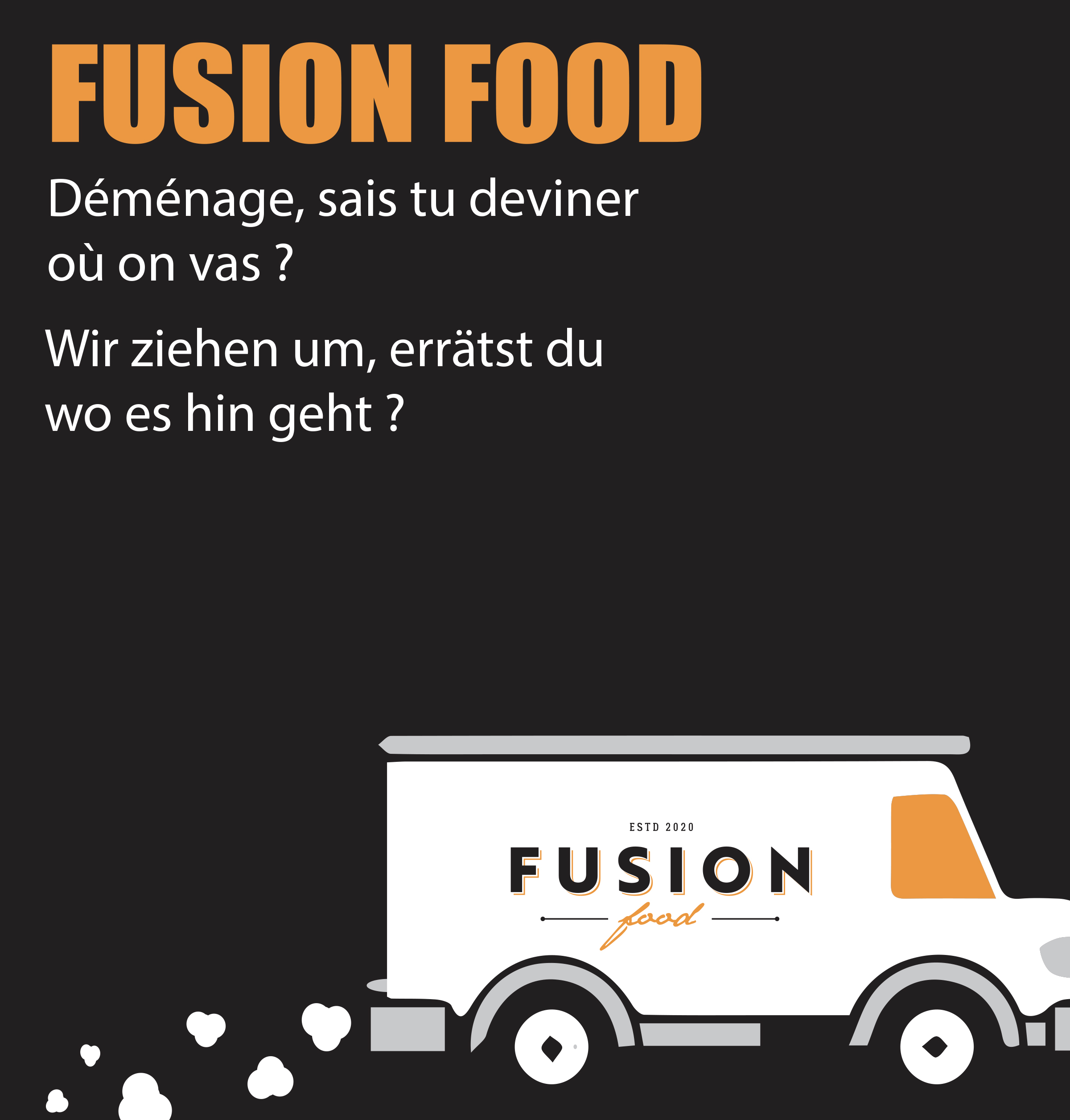 Fusion Food fermes ces portes pour un tout petit instant. Nous seront bientot de retour pour vous avec plus de choix un tout nouveaux Food Truck et un nouveaux emplacement. Nous sommes désolé pour les quelques semaines que vous ne pourriez plus manger nos delices mais nous avons hâte de vous retrouver très vite.